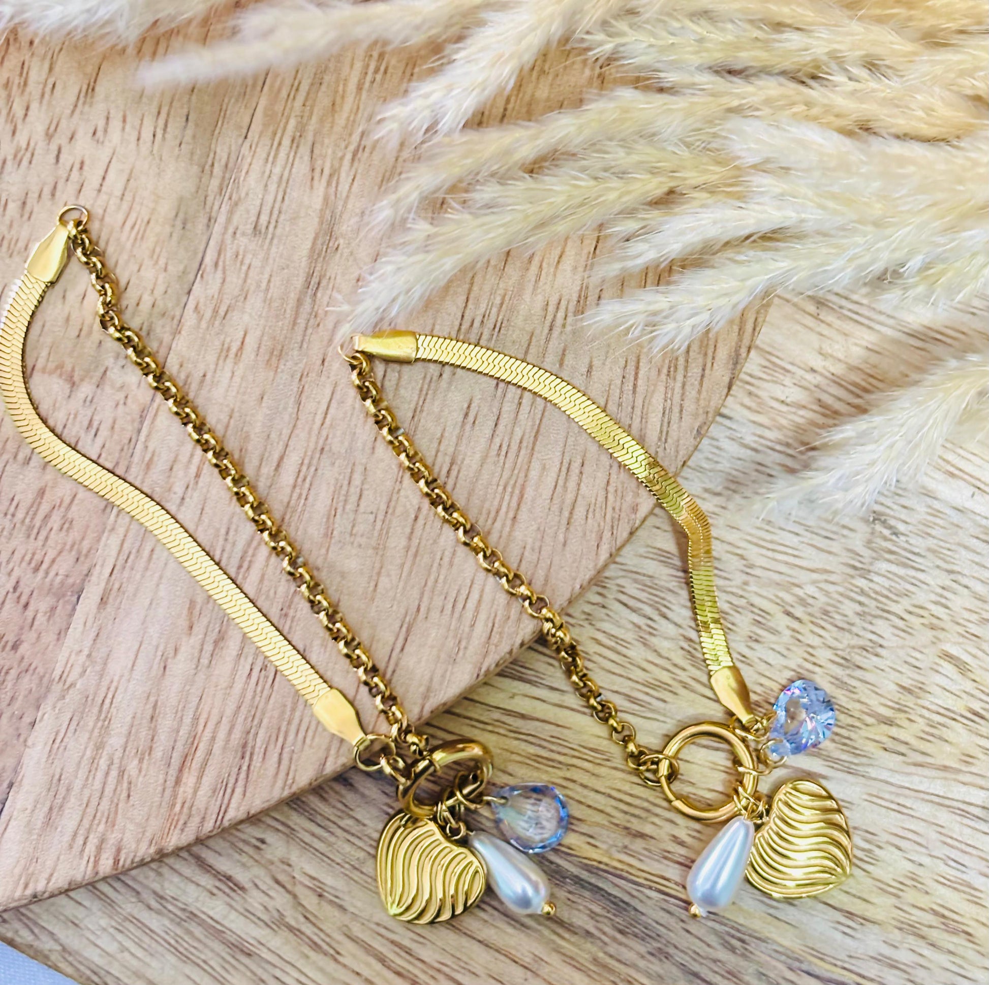 The Celestial Affection Pearl Bracelet features premium anti-tarnish coating that preserves its lustrous finish over extended wear. Crafted from hypoallergenic materials, this double chain adjustable bracelet with heart and stone pearl detailing ensures comfort for sensitive skin while maintaining its elegant appearance. The specialized metal treatment provides lasting protection against oxidation, making it an ideal choice for daily wear without compromising on quality or aesthetic appeal.